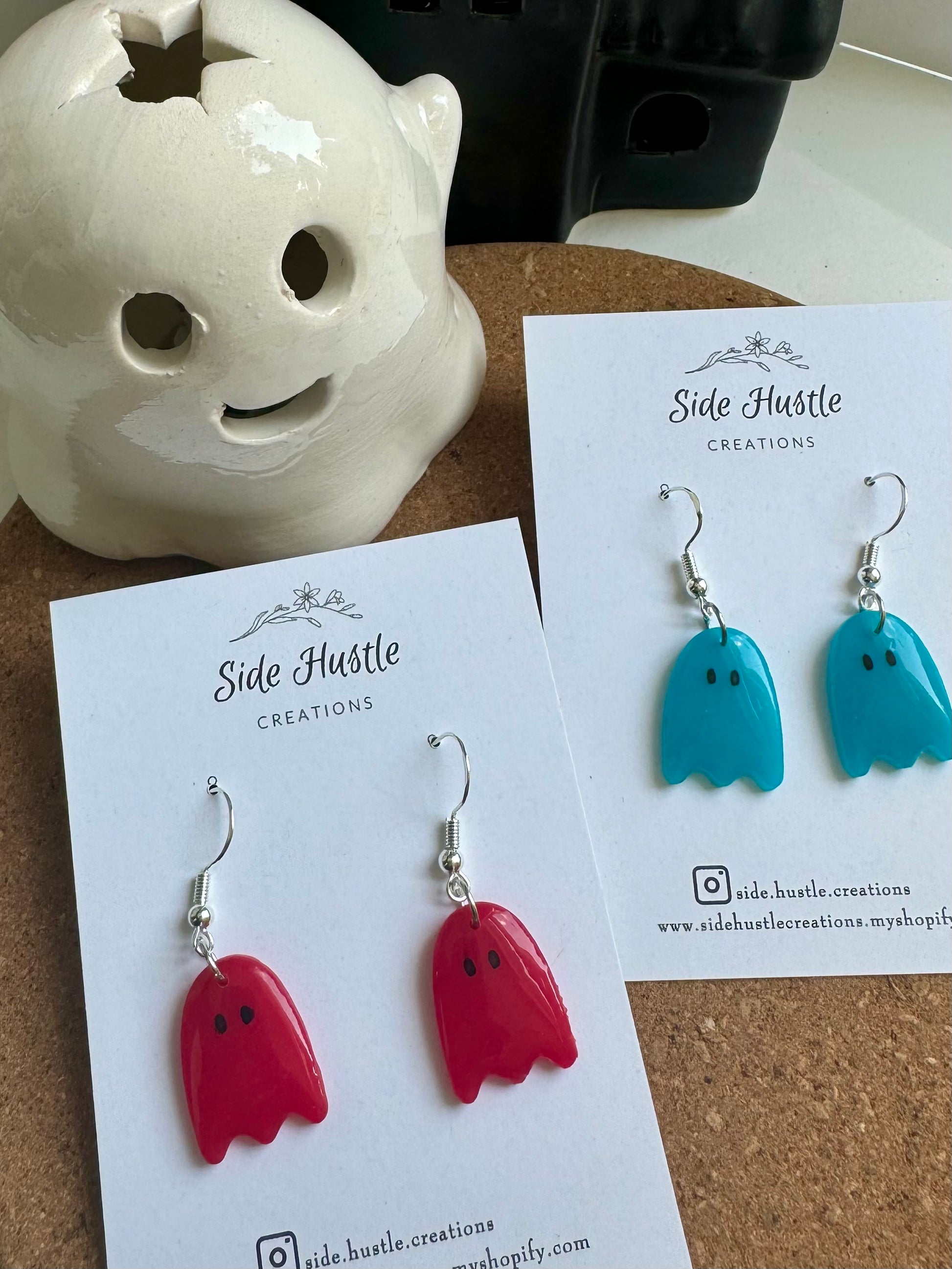 PAC man style ghosts in bright translucent clay topped with UV resin on a nickel free silver fish hook.